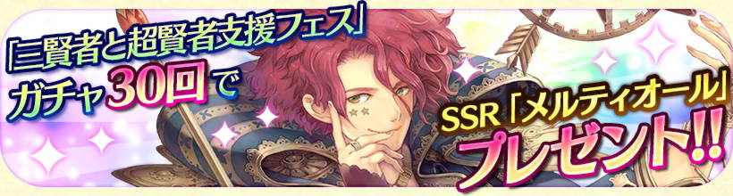 期間中、「三賢者と超賢者支援フェス」を30回引くと、SSR魔法使い「力の賢者 メルティオール」をプレゼント!